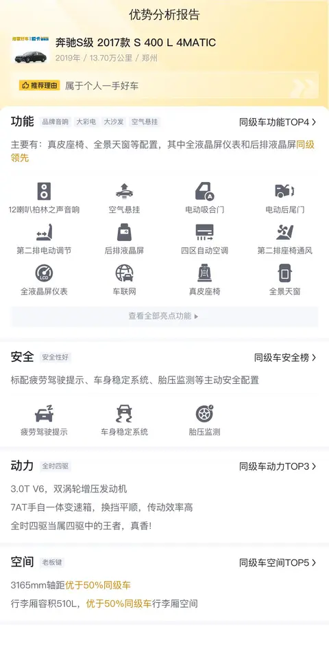缺点则是,奔驰S级这样的豪车,保养费用比较高,后期使用成本会比较高。此外,这台车的里程数超级高,13.7万公里,这个公里数下,可能会增加一些保养费用。最后,研究显示,大排量内燃机汽车的二手售价普遍比小排量内燃机汽车和电动汽车更低。购买二手车时,请务必全面考虑这些车辆的维护和修理成本,以及它们可能需要的特殊护理。