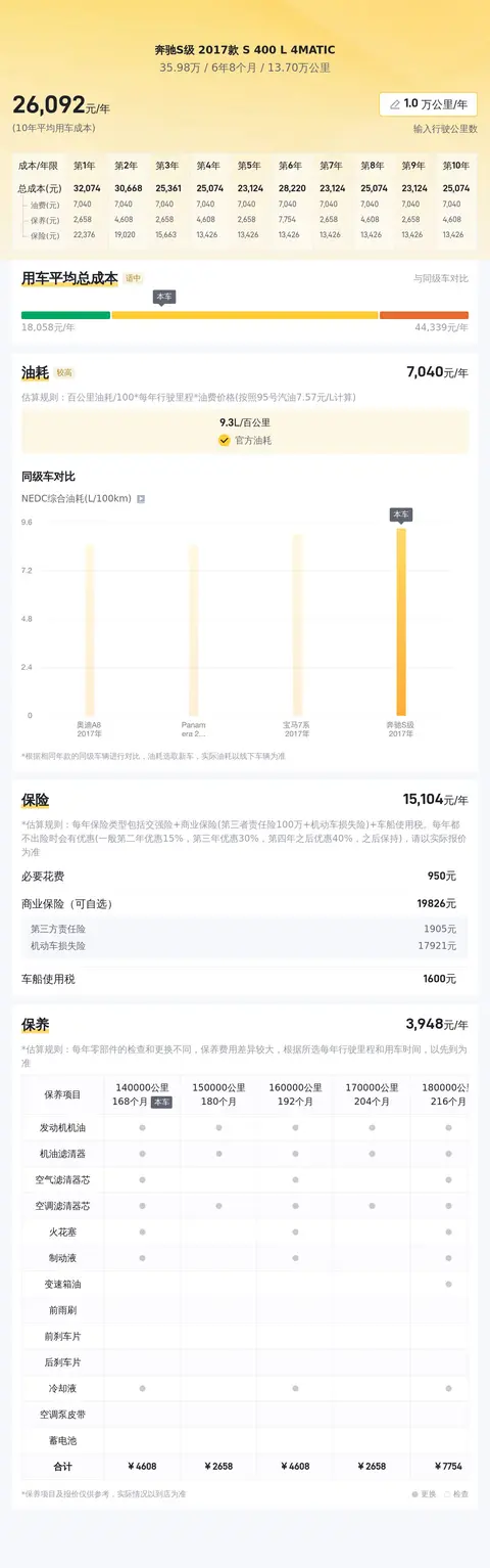 据估算,同级车的最低用车成本是21709元/年,最高是46718元/年,奔驰S级 2017款 S 400 L 4MATIC是25677元/年,用车成本较低。