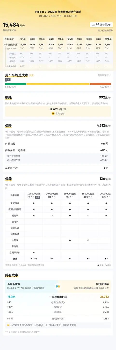 在用车成本方面,根据估算,这辆车的年均综合用车成本约1.5万元左右。由于用车成本跟车主的用车场景和用车强度以及开车习惯有很大关系,所以这项费用会有上下波动,仅供参考。
