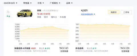 探歌定位于紧凑型SUV,根据车型定位以及现款车型售价来看,同级车型有日产逍客(指导价格12.59万元起)、丰田锋兰达(2026款指导价格13.28万元起)等。根据销量数据显示,今年8月,探歌销量为4521辆。更多消息,懂车帝将持续关注。