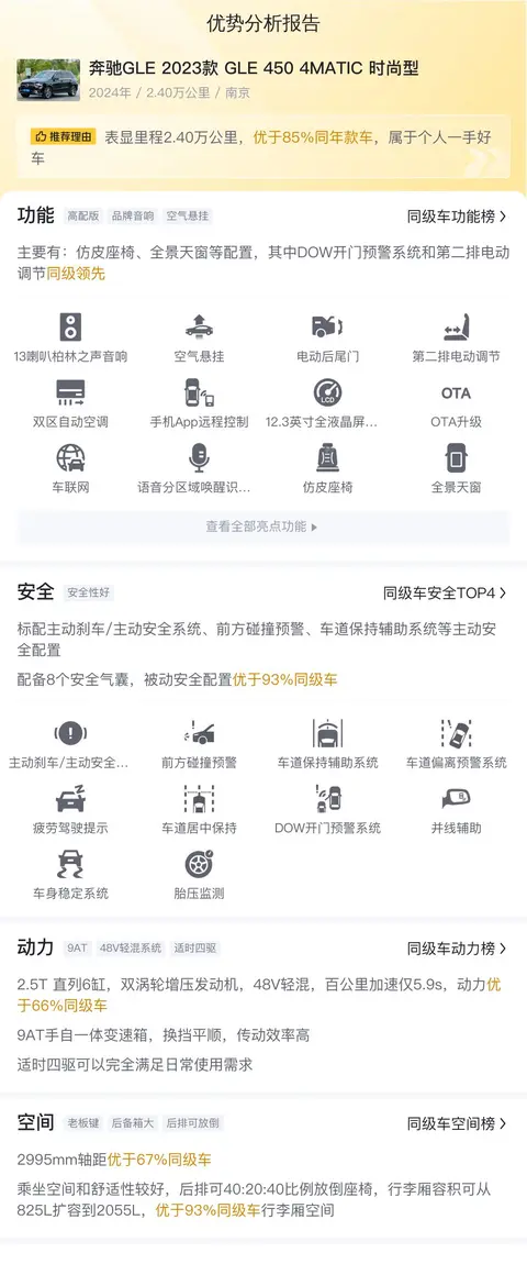 优点:奔驰GLE在市场上的认可度很高,这款车配置丰富,动力强劲,内饰豪华,又是2023款的车型,使用时间不长,里程也比较低,而且奔驰GLE属于越老越值钱的车型,保值率比较高,入手不亏。