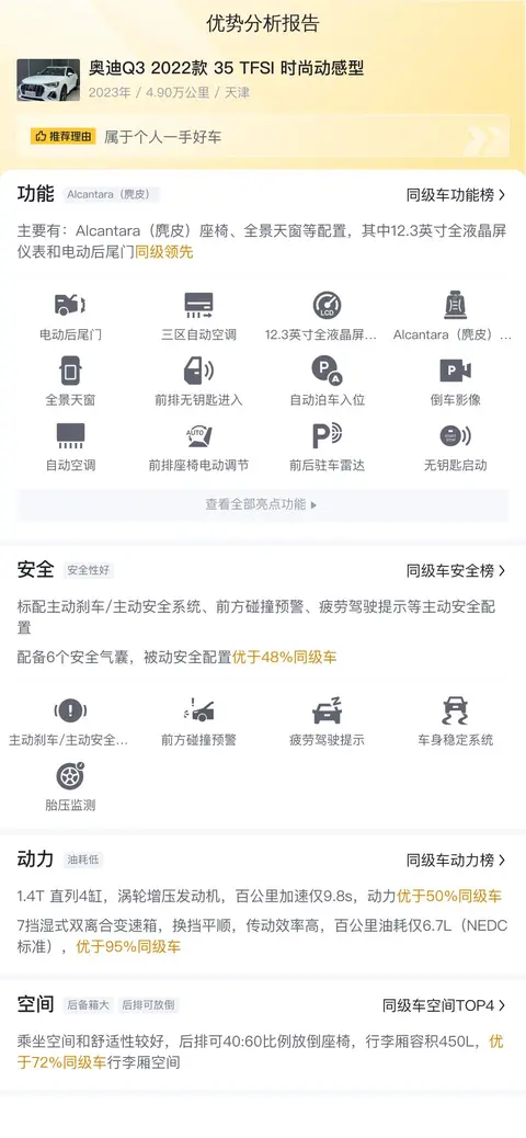 在众多同级别车型中,这辆奥迪Q3 2022款 35 TFSI 时尚动感型在安全、动力和空间等方面表现出色,为驾驶者和乘客提供了卓越的驾乘体验。以下是对其各项优势的详细分析: