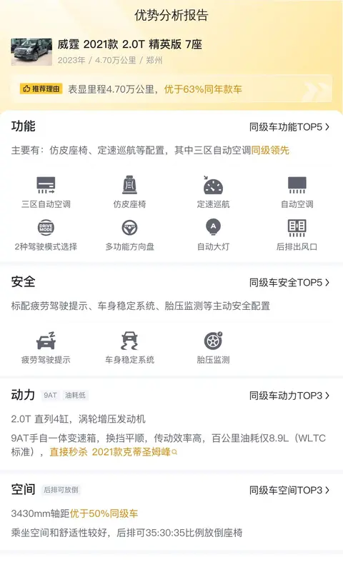 优势:报价较低,威霆 2021款 2.0T 精英版 7座的市场行情价是21.07万-25.17万,它的报价是20.98万,所有价格上有优势。知名度不错,属于热门车型,保值率高。配置丰富,安全性也高,动力强悍,是一款能够适应多种场合的车子。