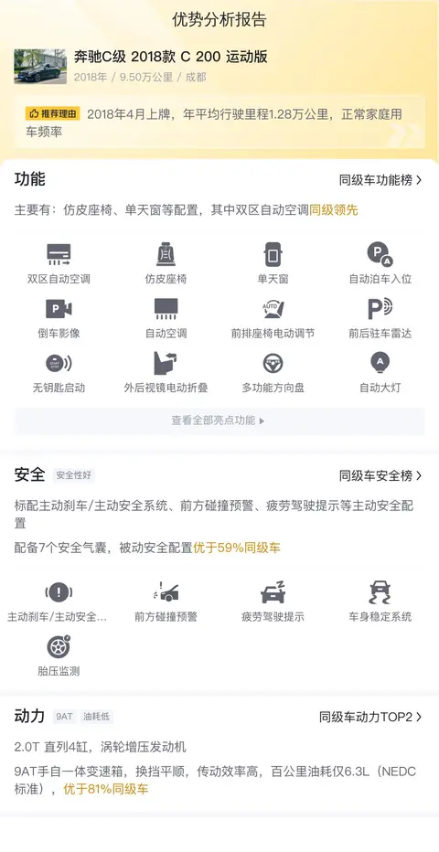 市场行情方面,当前这款奔驰C级 2018款 C 200 运动版的二手车报价在10.28万元人民币。考虑到这款车的车况良好、里程适中以及奔驰品牌的影响力,这一价格对于追求性价比的消费者来说,无疑是一个不错的选择。在豪华中级车市场中,奔驰C级 2018款 C 200 运动版以其卓越的性能、豪华的内饰和合理的价格,成为了一款备受瞩目的车型。无论是日常通勤还是周末出游,它都能为您提供舒适、安全和愉悦的驾乘体验。