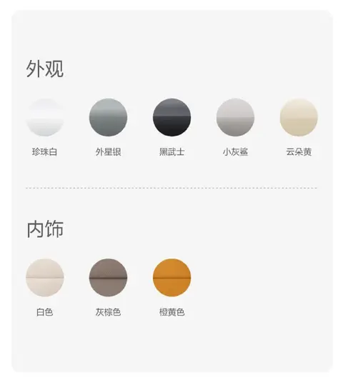 首先外观有珍珠白、外星银、黑武士、小灰鲨、云朵黄五种配色,其中小灰鲨和云朵黄的选装价格为 6000 元。