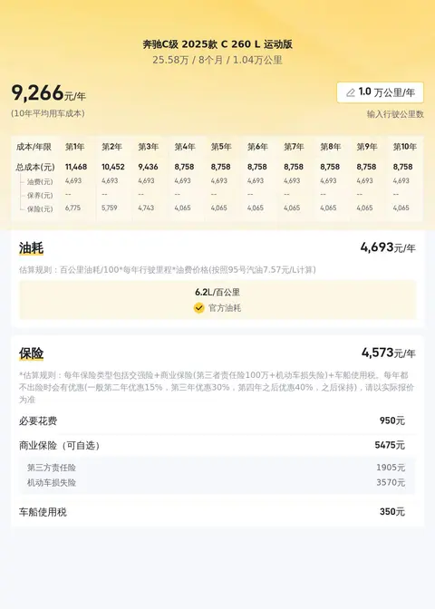 奔驰C级 2025款 C 260 L 运动版的二手车市场行情大致在24.03万至28.73万之间。具体售价因车辆条件而异,包括车龄、里程数、所在地以及车况等因素。该车目前售价25.58万,预计再行驶2年后可卖19万,约折价24.2%。用车成本方面,该车的年均综合用车成本约为9070元。然而,请注意,实际费用可能因使用频率、油价波动、保险政策和地区差异等因素而有所不同。