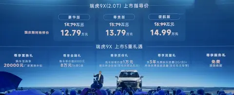 [懂车帝原创 产品] 9月27日,奇瑞汽车宣布,瑞虎9(图片|配置|询价)X、新款瑞虎9及新款瑞虎9 C-DM上市,瑞虎9X官方指导价为14.79万元起,国庆限时抢鲜价12.79万元起;新款瑞虎9官方指导价为15.29万元起,国庆限时抢鲜价13.79万元起;新款瑞虎9 C-DM官方指导价为16.59万元起,国庆限时抢鲜价15.59万元起。瑞虎9系列定位为燃油/插混动力中型SUV,本次上市车型可视为年度改款,其中燃油版新增中配定位的耀享版,插混版增加大容量电池车型。瑞虎9X属于瑞虎9系列衍生的新车型,在外观、内饰方面都有明显修改,并且轴距在新款瑞虎9之下,配置增加猎鹰500辅助驾驶系统等。