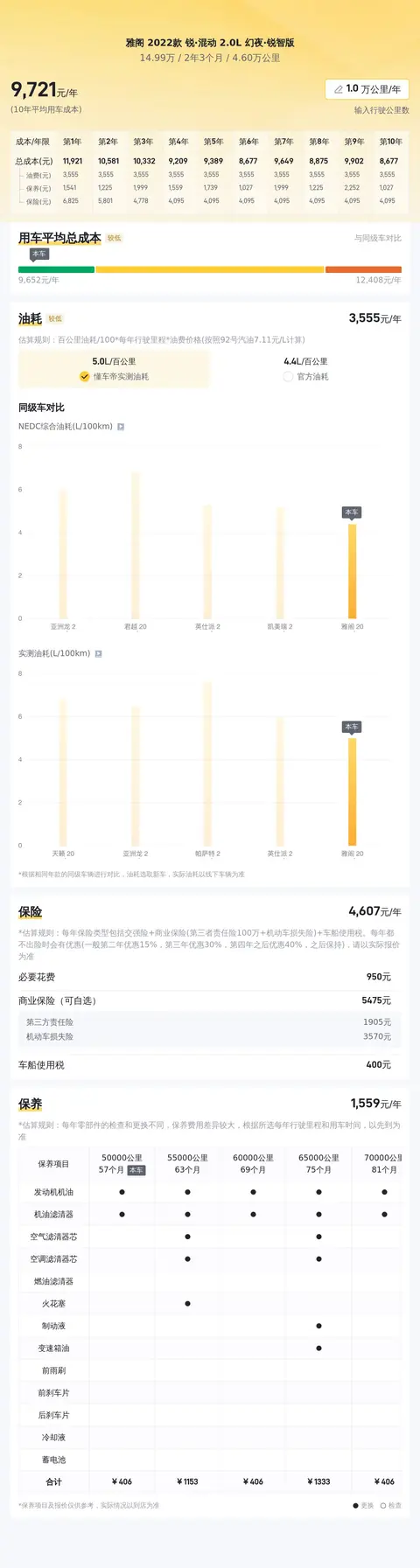 另外,同级车的最低10年平均用车成本是6141元/年,最高是11746元/年,雅阁 2022款 锐·混动 2.0L 幻夜·锐智版是10080元/年,所以用车成本偏高。