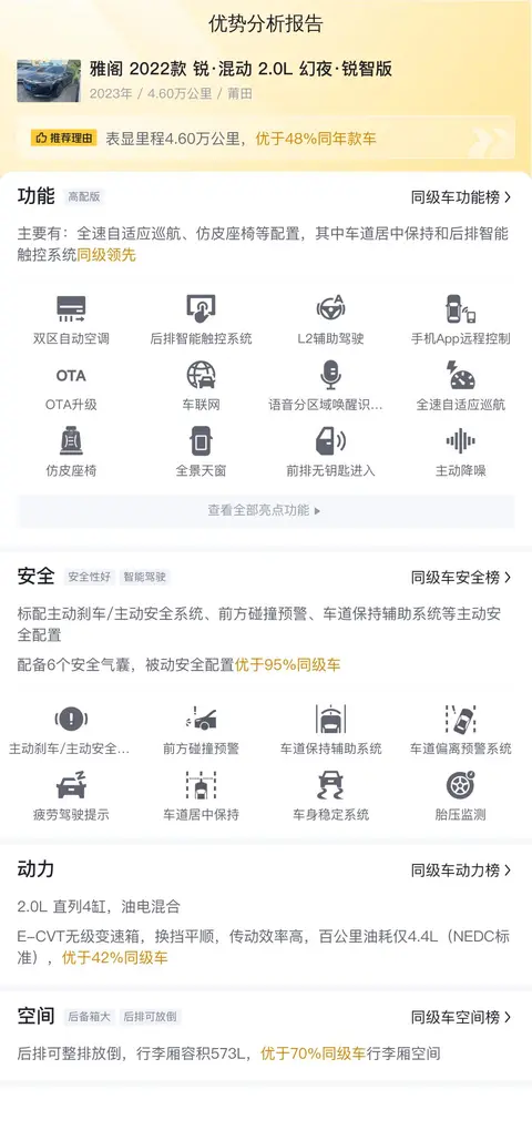 综上所述,雅阁 2022款 锐·混动 2.0L 幻夜·锐智版在动力、安全配置和油耗方面表现出色,是一款适合日常使用的车型。然而,其内饰质量和起步动力可能不尽如人意,且保值率一般。因此,在购买时需根据个人需求和偏好进行综合考虑。希望我们的分析可以帮助您做出明智的决策。