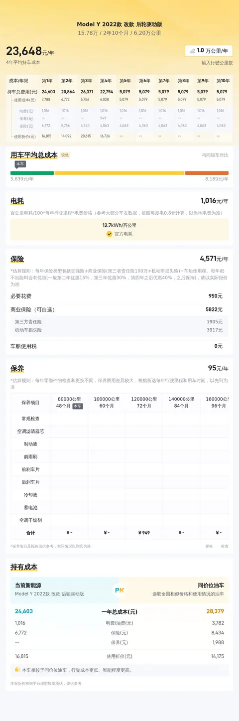 据估算,Model Y 2022款 改款 后轮驱动版的用车成本是23776元/年,同级车最低是5278元/年,最高是26938元/年,相对较高,但行驶成本较低,因为同级车最低是10160元/年,最高是16301元/年,而Model Y 2022款 改款 后轮驱动版是10601元/年。