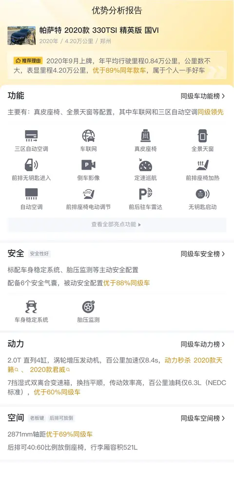 懂车帝根据大数据分析,帕萨特 2020款 330TSI 精英版的市场行情价是9.53万-11.41万,它的报价则是10.38万,价格虽然合理,但优势不明显。