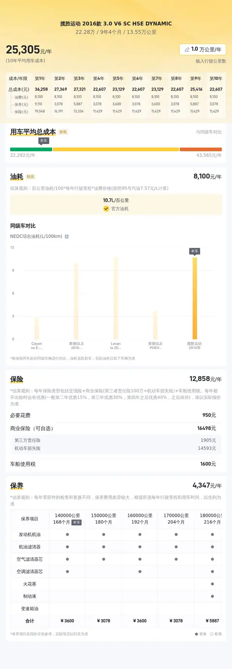 具体到这款二手路虎揽胜运动,它的售价为22.28万 元。关于用车成本部分,我们将通过详细分析油耗、保险以及保养等费用,为您提供一个清晰的用车成本概览。首先,我们来谈谈油耗成本。根据官方数据,这款揽胜运动版的百公里综合油耗为10.7升。假设每年行驶2.5万公里,按照当前油价计算(假设油价为8.02元/升),每年的油费支出约为21454元。接下来,我们聊聊保险费用。保险是每位车主必须考虑的一项开支。对于这款揽胜运动版,我们估算的每年保险费用大约为11417元。保险费用的具体金额可能会因保险公司和政策的不同而有所差异,但这个估算可以为您提供一个大致的参考。最后,我们不能忽视保养费用。由于这款车型已行驶13.55万公里,保养费用相比新车期间可能会有所增加。我们估算的每年保养费用大约为6408元。保养费用的具体金额同样可能会因维修店和所需更换的零部件而有所不同,但这个估算可以为您提供一个大致的参考。综上所述,这款二手路虎揽胜运动的年均综合用车成本大约为39280元。需要注意的是,实际用车成本可能会因多种因素而有所差异,包括个人驾驶习惯、行驶里程、油价波动、保险政策和保养情况等。因此,在购买二手车时,建议您根据自己的实际情况和需求进行综合考虑和评估。