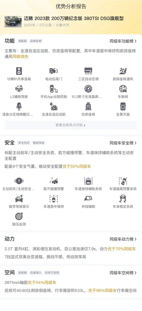 综上所述,这款迈腾2023款200万辆纪念版380TSI DSG旗舰型是一款集豪华、舒适和实用于一体的二手车。它不仅拥有出色的性能和丰富的配置,还具备较高的性价比和较低的用车成本。如果您正在寻找一款既能满足日常出行需求又能提升生活品质的二手车,那么这款迈腾无疑是一个值得考虑的选择。当然,在购买二手车时,我们还需要注意车况的检查、手续的办理等问题。我们强烈建议您在作出购买决定之前,务必亲自到店查看车辆实际情况,以确保它符合您的期望和需求。