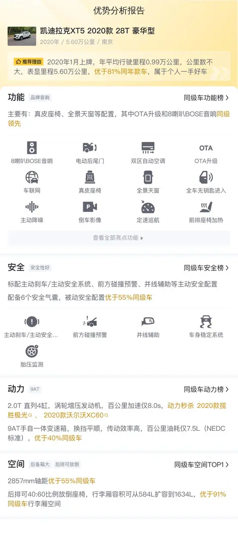 这辆凯迪拉克XT5 2020款 28T 豪华型在动力性能、内饰、舒适性和安全性等方面具备明显优势。经过懂车帝对这款车的分析,发现这款车在动力性能和内饰方面相较于同级别竞品车型具有一定的优势。