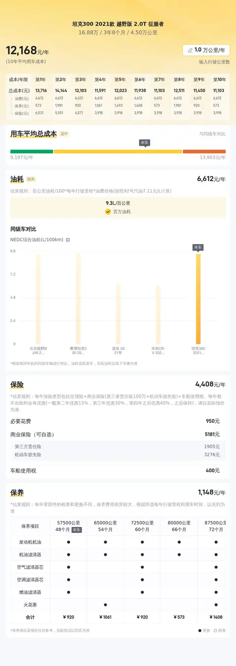 据估算,同级车的最低用车成本是5335元/年,最高是12866元/年,坦克300 2021款 越野版 2.0T 征服者是12181元/年,所以比较高。