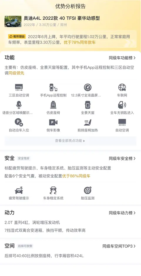 综上所述的新车含税价、用车成本、市场行情、优势分析、同款比价等数据仅供参考。在配置部分,因为二手车非标品,车辆可能会存在配置改装的情况,具体车况信息需要线下结合车辆实际情况进行综合参考。