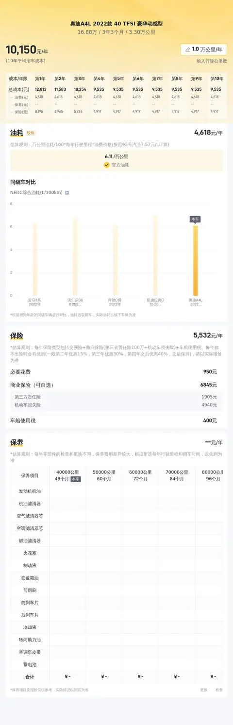 根据当前市场行情,这辆奥迪A4L 2022款 40 TFSI 豪华动感型的售价为16.88万元。从用车成本来看,按照每年行驶2万公里计算,10年平均用车成本约为14907元/年,相较于同级别车型来说,性价比较高。