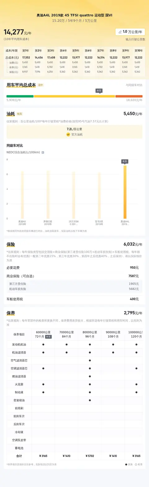 基于懂车帝对奥迪A4L 2019款 45 TFSI quattro 运动型 国VI的分析,该车目前的二手车售价为15.20万元。考虑到车辆的年均行驶里程为1.3万公里,按照每年行驶2万公里计算,结合其10年平均用车成本为14663元/年,这是一个相对合理的支出水平。在同级别车型中,A4L的均值为14663元/年,而同级车最低10年平均用车成本为11860元/年,最高为17786元/年。因此,这款车的用车成本处于适中的水平。