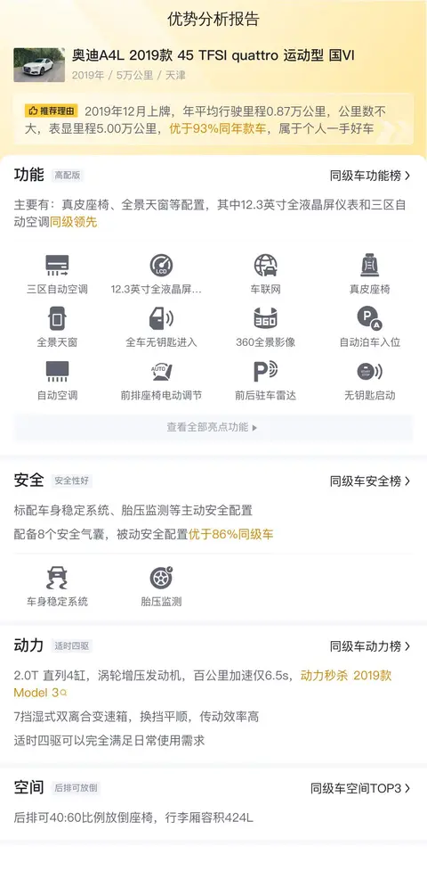 今天介绍的这款奥迪A4L 2019款 45 TFSI quattro 运动型 国VI版二手车,位于天津,上牌时间为2019年12月,行驶里程5万公里,白色车身深色内饰,新车指导价40.18万,二手车报价15.2万,过户次数0次。支持分期购车,首付4.56万即可开回家。