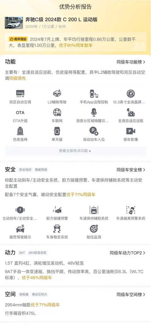 先介绍一下这辆车的基本信息,该车的具体版本是——奔驰C级 2024款 C 200 L 运动版,上牌地为台州,上牌日期2024年7月,表显里程为1万公里,车身颜色为白色,新车指导价33.32万,二手车报价22.68万,过户次数1次。看这辆车的挂牌时间和行驶里程,基本也就是准新车的状态了。