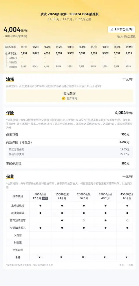 从用车成本来看,凌渡 2024款 凌渡L 280TSI DSG酷辣版的10年平均成本大约在10180元左右,这一数字在同级别车型中属于合理范围。值得注意的是,由于该车几乎没有使用痕迹,其实际用车成本很可能会低于这个平均值。