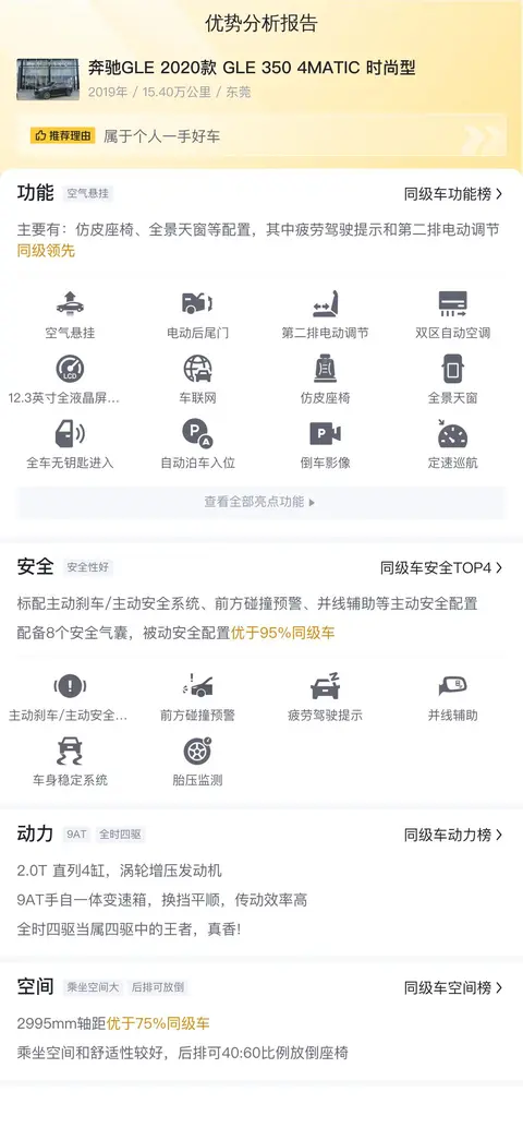 优点:奔驰GLE在空间和配置上都比较不错,毕竟是原价七八十万的车,而且动力强劲,如今只要33.8万,价格尚可接受,入手压力不大。保值率也比较不错,品质好,用着省心。