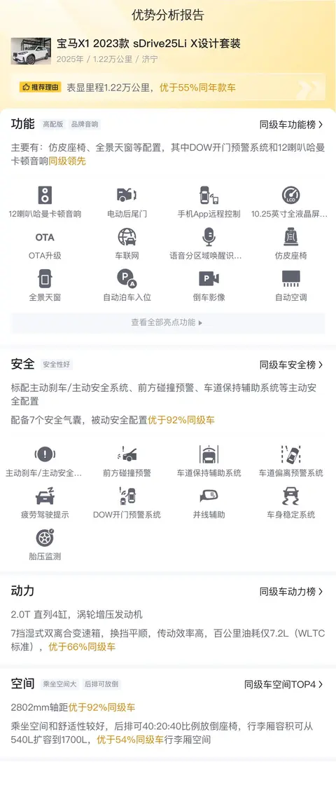 宝马X1(图片|配置|询价)作为宝马品牌在紧凑型SUV市场的得力战将,自2009年第一代车型诞生以来,便以其独特的市场定位和不错的使用体验吸引了无数粉丝。不断进化的技术以及更加符合消费者需求的设计,让宝马X1在豪华紧凑型SUV领域中始终保持着强大的竞争力。今天咱们看的这一款宝马X1 2023款 sDrive25Li X设计套装,是2025年1月上牌的车型,目前跑了有1.22万公里,车源地和上牌地都是济宁,有1次过户记录,新车含税价33.56万,目前19.4万对外出售,咱看看这款车怎么样。