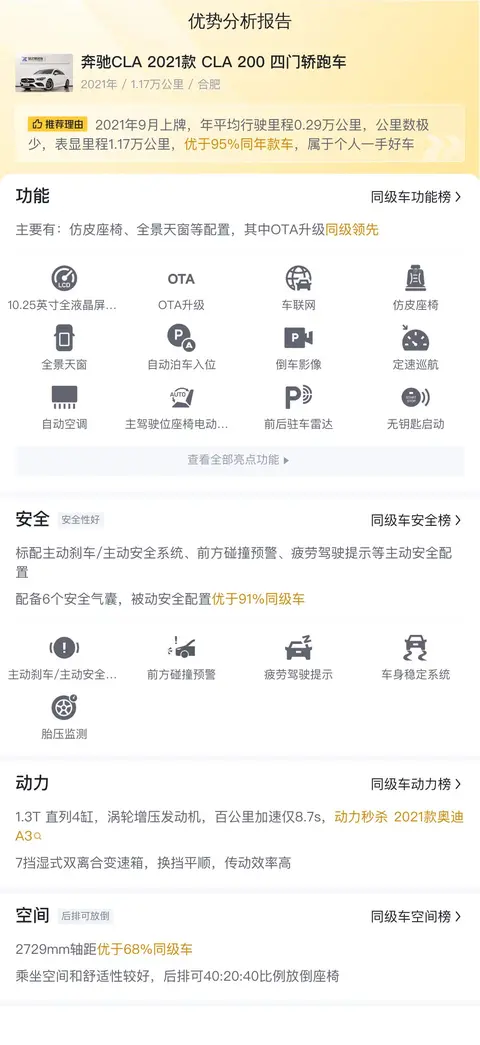 奔驰CLA(图片|配置|询价)自2013年首次亮相以来,以其独特的四门Coupe设计和合理的价位,在全球市场尤其是欧洲和中国市场获得了不错的销量。它瞄准追求个性、时尚和科技感的年轻人,与宝马2系Gran Coupe和奥迪A3 Sportback直接竞争。不断升级动力系统、智能互联科技,并引入更多个性化选项,持续吸引着年轻消费群体。那么下面这一辆奔驰CLA 2021款 CLA 200 四门轿跑车,是在2021年9月上牌,仅仅跑了1.17万公里,报价16.2万,属于比较低的报价了。