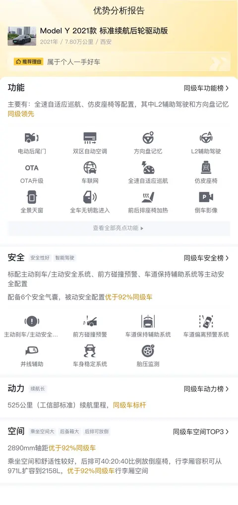 全球首富马斯克一直致力于打造一款既能满足家庭出行需求,又能兼顾环保和性能的纯电动汽车。而Model Y正是这个计划的完美呈现。它不仅继承了特斯拉一贯的前卫设计,还拥有了强大的动力系统和宽敞的内部空间。无论是城市通勤还是长途旅行,Model Y都能提供流畅的驾驶体验和舒适的乘坐感受。今天为大家带来的这辆二手Model Y 2021款 标准续航后轮驱动版,可以充分验证以上内容。