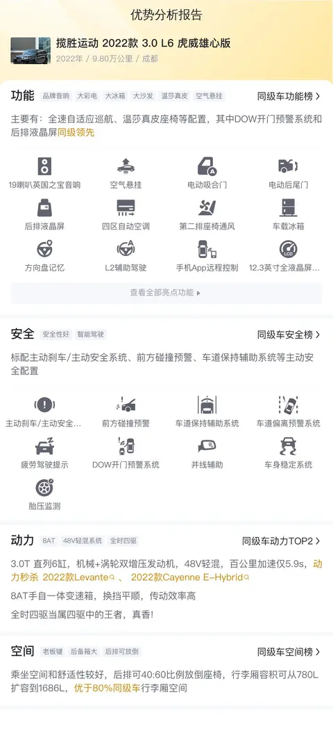 综上所述的新车含税价、用车成本、市场行情、优势分析、同款比价等数据仅供参考。在配置部分,因为二手车非标品,车辆可能会存在配置改装的情况,具体车况信息需要线下结合车辆实际情况进行综合参考。