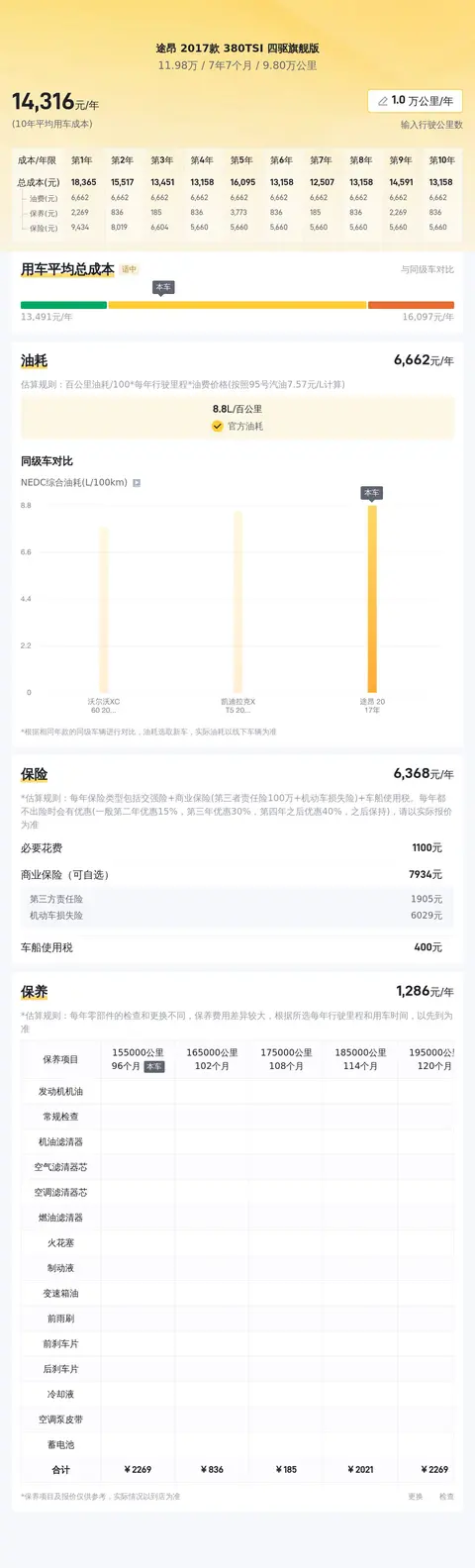 据估算,途昂 2017款 380TSI 四驱旗舰版的用车成本较低,因为它的用车成本是14520元/年,同级车最低用车成本是13653元/年,最高用车成本是17340元/年。