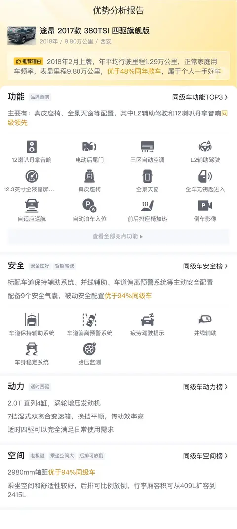 途昂 2017款 380TSI 四驱旗舰版的配置比较一般,配备了第二排电动调节、第二排座椅加热、方向盘加热、手机互联映射、360度全景影像等配置。安全配置上,标配主动刹车/主动安全系统、前方碰撞预警、车道保持辅助系统等主动安全配置,配备7个安全气囊,被动安全配置优于94%同级车。
