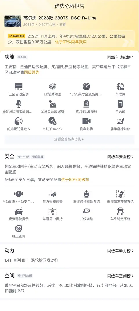 综上所述,这辆2023款高尔夫280TSI DSG R-Line不仅拥有出色的性能表现,还具备了实用性强、配置丰富等多重优势。如果您正在寻找一款性价比高的二手车,那么它绝对是一个值得考虑的选择。