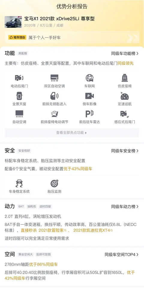 综上所述的新车含税价、用车成本、市场行情、优势分析、同款比价等数据仅供参考。在配置部分,因为二手车非标品,车辆可能会存在配置改装的情况,具体车况信息需要线下结合车辆实际情况进行综合参考。
