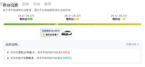 在市场行情部分,当前这款车的市场行情大致在23.77万至28.31万之间。需要注意的是,二手车因车况等因素导致价格差异较大,本车报价为26.80万,