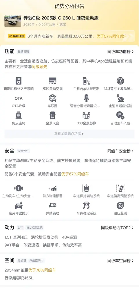 我们先了解一下这辆车的基本信息,该车的具体版本是——奔驰C级 2025款 改款 C 260 L 皓夜运动版,车身颜色为白色,截至到2025年10月,该车行驶里程仅为0.5万公里,该车符合国VI排放标准。车源地和上牌地均为武汉。2024年4月首次上牌,在此期间过户1次。目前该车报价为26.8万元,相比新车指导价38.06万元便宜了11.26万元。