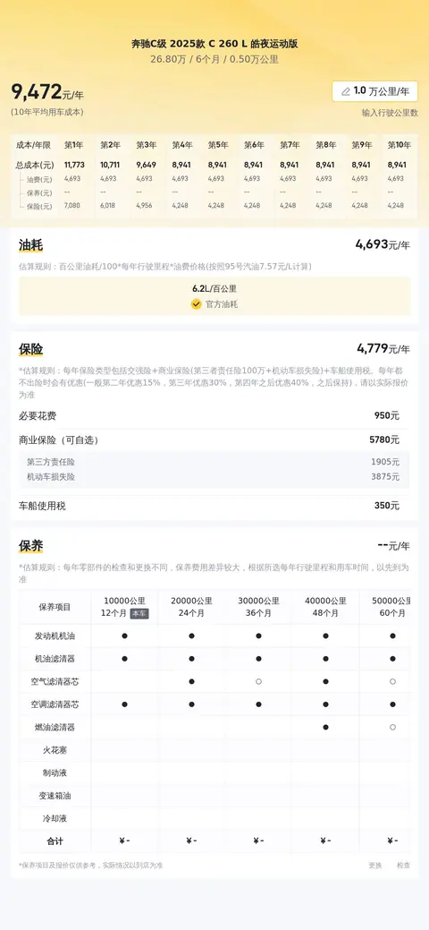 关于用车成本,参考同级别车型的平均用车成本,该车的平均用车成本约为9189元/年,需要注意的是,每个人的用车场景和用车强度不同,会导致用车成本有较大差异。