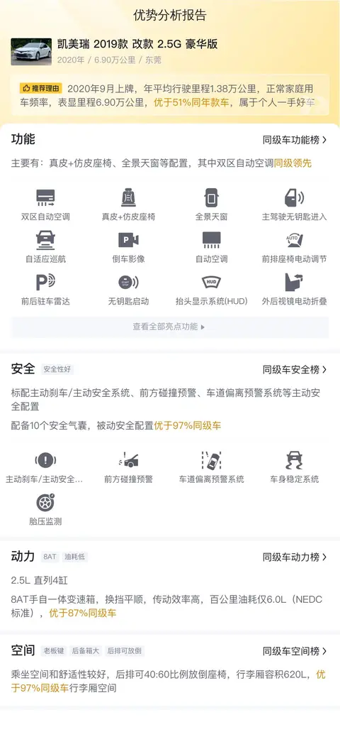 同级对比方面,凯美瑞2019款改款2.5G豪华版在动力、油耗、空间方面具备明显优势,舒适性和操控性方面也获得了广大车主的一致好评,当然每一台车都有优缺点,没有一台车可以让所有人都满意,只有您自己才知道什么最重要。