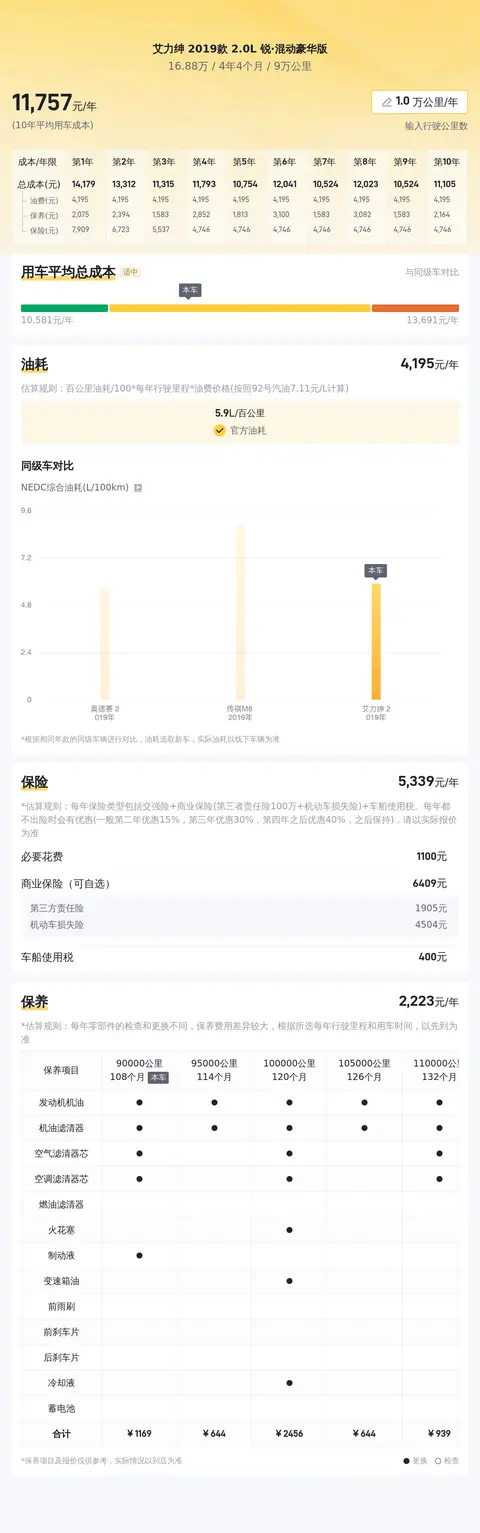 据估算,艾力绅 2019款 2.0L 锐·混动豪华版的用车成本较低,因为同级车最低用车成本是6306元/年,最高是13786元/年,而艾力绅 2019款 2.0L 锐·混动豪华版是11580元/年,所以较低。