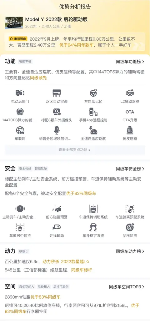 Model Y之所以能够成为全球销冠,最重要原因之一就是它的价格,而这款Model Y 2022款 后轮驱动版,跑了一点里程,价格却很低,更突显其性价比。