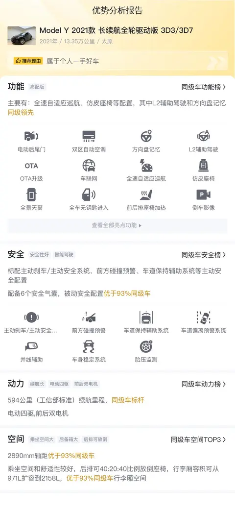 买家买二手车,肯定得挑车况好的,配置也得跟上。这辆二手Model Y配了很多实用功能,像全速自适应巡航、方向盘记忆这些,特别是它的L2辅助驾驶和方向盘记忆,在同级别的车里算是领先的,用起来方便又安全。虽然是两年前的车,但配置还挺新潮,符合现在智能电动车的标准。