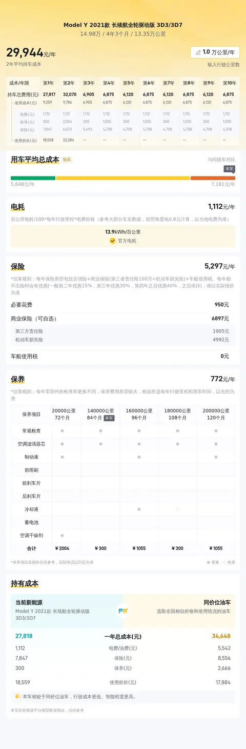 选二手车,还得看市场行情。目前这辆二手Model Y的售价在14.98万,价格还算公道。预估的用车成本是每年3.1万左右,但实际花费得看个人使用情况,可能会有所不同。总的来说,这车性价比不错,买了能省不少钱,用着也挺省心。