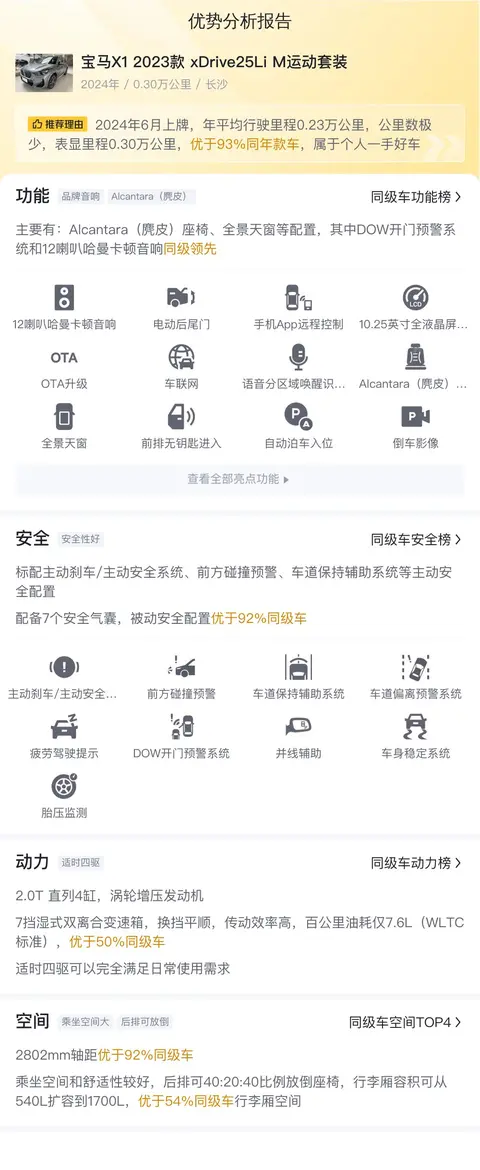 该车是宝马X1 2023款 xDrive25Li M运动套装,车源地是长沙,上牌地是长沙,新车含税价36.89万,现在只要20.93万,也就是六二折。该车首次上牌2024年6月,车龄0.3年,行驶里程0.3万公里,优于56%同年款车,该车个人一手车,未曾过户,车身颜色为深灰色,漆面原版原漆,车况精品,支持分期购车。