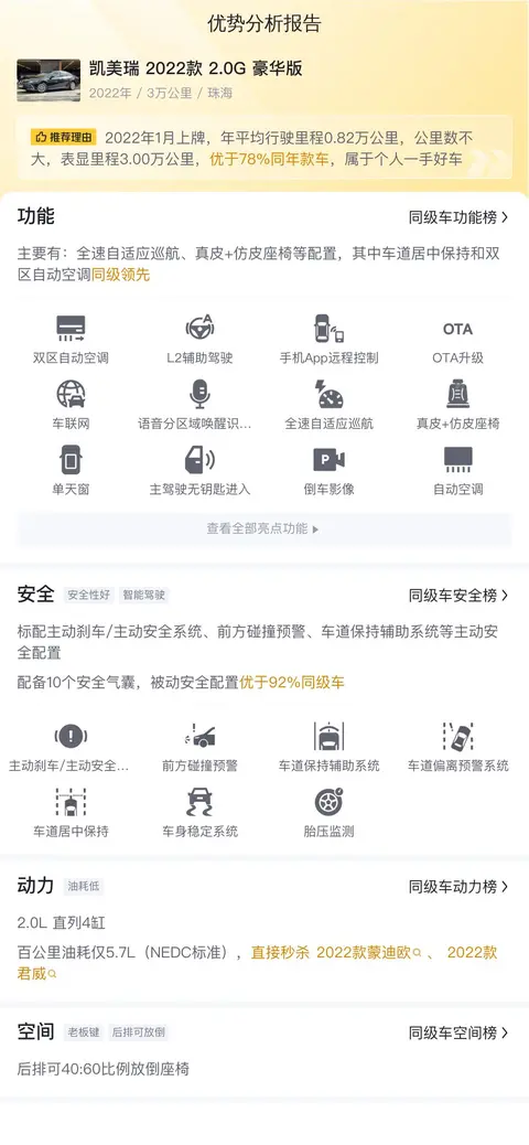 综上所述的新车含税价、用车成本、市场行情、优势分析、同款比价等数据仅供参考。在配置部分,因为二手车非标品,车辆可能会存在配置改装的情况,具体车况信息需要线下结合车辆实际情况进行综合参考。
