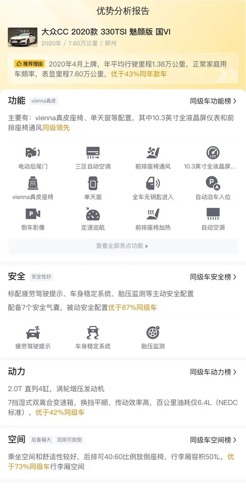 综上所述的新车含税价、用车成本、市场行情、优势分析、同款比价等数据仅供参考。在配置部分,因为二手车非标品,车辆可能会存在配置改装的情况,具体车况信息需要线下结合车辆实际情况进行综合参考。