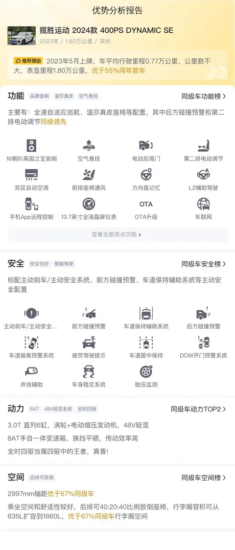 接下来为您介绍的这款二手揽胜运动 2024款 400PS DYNAMIC SE,上牌地车源地均为广东深圳,上牌日期2023年05月,表显里程1.80万公里,白色车身深色内饰,新车指导价106.80万,二手车报价69.80万,过户次数1次。支持分期购车,首付20.9万即可拥有它。