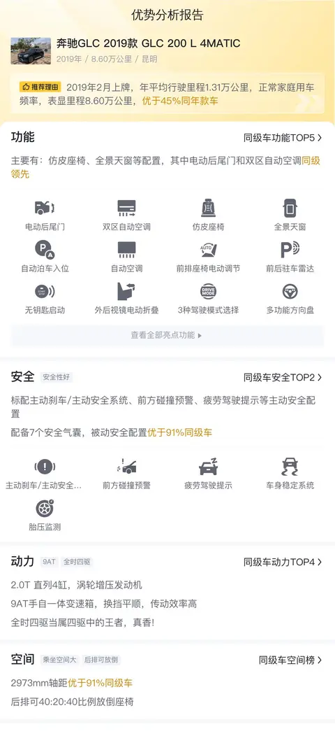 综上所述,奔驰GLC 2019款 GLC 200 L 4MATIC是一款集豪华、性能、安全、舒适于一体的豪华SUV。它在动力性能、操控稳定性、舒适性以及豪华感等方面都表现出色,能够为驾乘者带来更加愉悦和舒适的驾乘体验。同时,它的市场行情和用车成本也相对较为合理,具有较高的性价比和资产保值效果。如果您正在寻找一款豪华SUV作为日常代步或偶尔自驾出游的座驾,那么奔驰GLC 2019款 GLC 200 L 4MATIC将是一个不错的选择。需要注意的是,本车没有检测报告,建议您实地查看车辆具体情况。