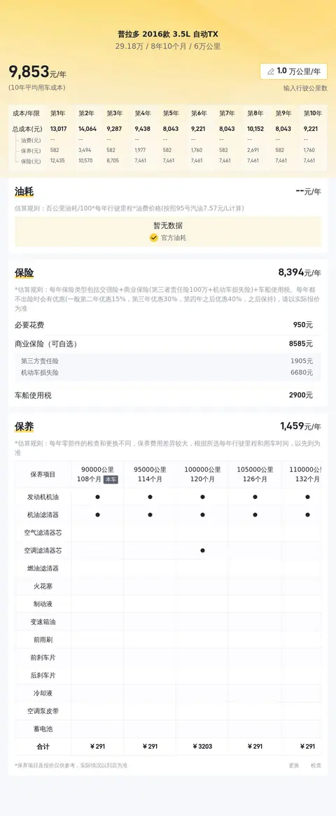 当前这款车的市场行情大约在30.6万-36.67万之间,文中介绍的这辆车的售价为29.18万,这个价格低于市场行情,是一个比较合理的售价。在用车成本方面,如上图所示,这款车的十年平均用车成本大约在每年2.2万元左右,具体金额跟车主的开车习惯有直接联系。以上数据仅供参考,具体数据以实际用车情况而定。