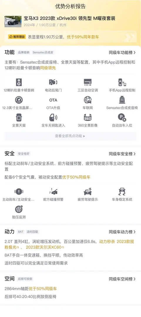 今天介绍的这款宝马X32023款 xDrive30i 领先型 M曜夜套装,外观颜色为黑色,内饰颜色为深色。此款车型搭载了直列4缸2.0T涡轮增压发动机,能产生245马力的最大功率和350牛·米的最大扭矩,匹配8挡手自一体变速箱,确保了迅捷的加速性能与出色的燃油效率。其NEDC综合油耗为8.7L/100km,兼顾了性能与节能。该车首次上牌时间为2024年12月,至今行驶里程为1.9万公里,车源所在地和上牌地均为杭州,该车有过1次过户记录。