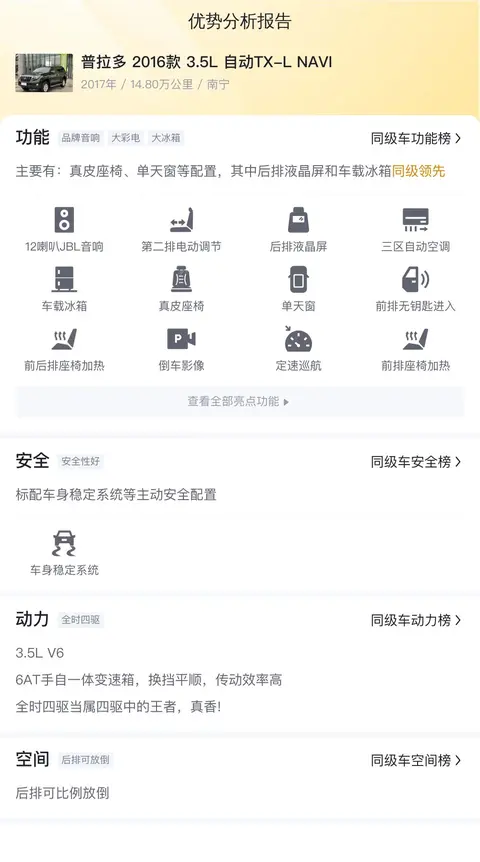 2016款的车,对于配置的要求不是多,而是要实用。普拉多 2016款 3.5L 自动TX-L NAVI配备了真皮座椅、单天窗、后排液晶屏、车载冰箱等配置,其中后排液晶屏和车载冰箱同级领先,能领先则代表有优势。安全配置上,标配车身稳定系统等主动安全配置,配备8个安全气囊,被动安全配置优于86%同级车。